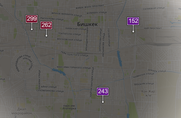 - в районе улиц Бейшеналиевой/Токтогула. Уровень загрязнения превышен в 6,42 раза: PM2.5 среднесуточный — 225 мкг/м³, на момент измерения — 299 мкг/м³;