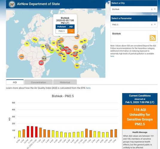 Посольство США в Кыргызстане также установило датчик. Он показывает индекс качества воздуха в режиме онлайн. Информация обновляется ежечасно.