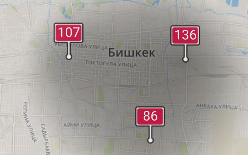 - в районе улиц Бейшеналиевой/Токтогула. Уровень загрязнения превышен в 2,43 раза: PM2.5 среднесуточный — 85 мкг/м³, на момент измерения 107 мкг/м³;