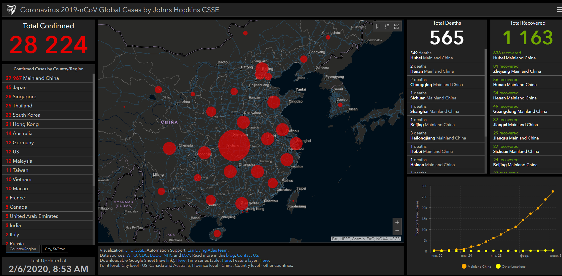 За последние сутки число погибших от нового коронавируса в Китае увеличилось до 565 человек. Об этом свидетельствуют данные онлайн-карты, разработанной учеными.