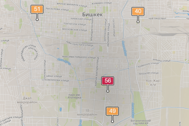 - в районе улиц Бейшеналиевой/Токтогула. Уровень загрязнения превышен в 1,23 раза: PM2.5 среднесуточный — 43 мкг/м³, на момент измерения — 51 мкг/м³;