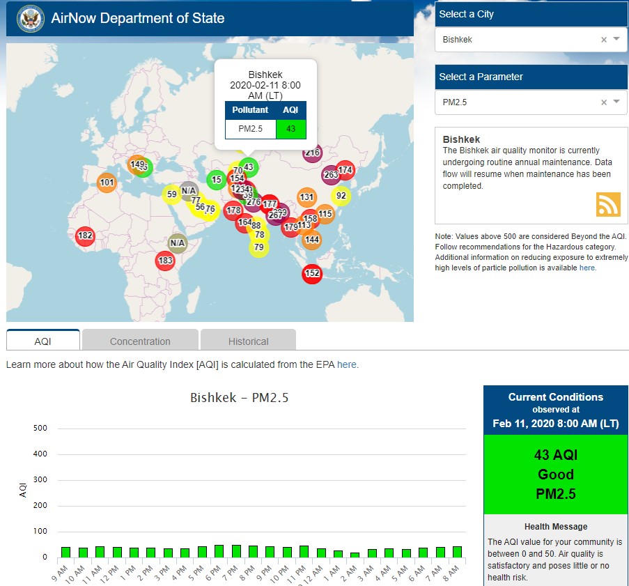 Посольство США в Кыргызстане также установило датчик. Он показывает индекс качества воздуха в режиме онлайн. Информация обновляется ежечасно.