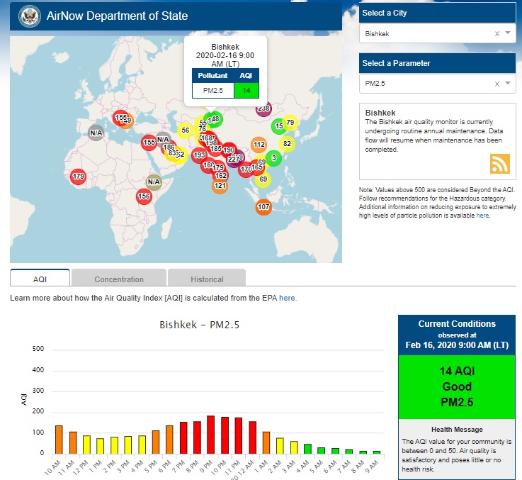 Посольство США в Кыргызстане также установило датчик. Он показывает индекс качества воздуха в режиме онлайн.