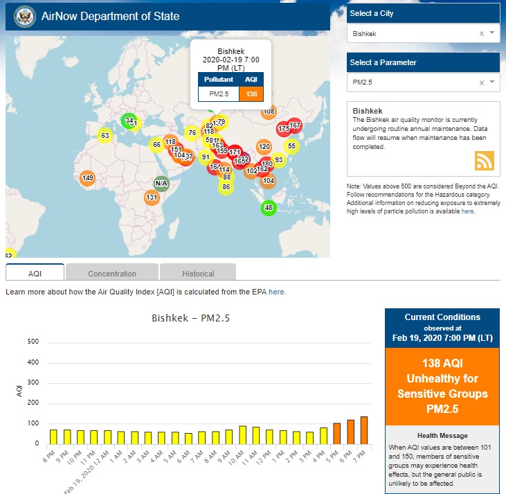 Посольство США в Кыргызстане также установило датчик. Он показывает индекс качества воздуха в режиме онлайн. Информация обновляется ежечасно.