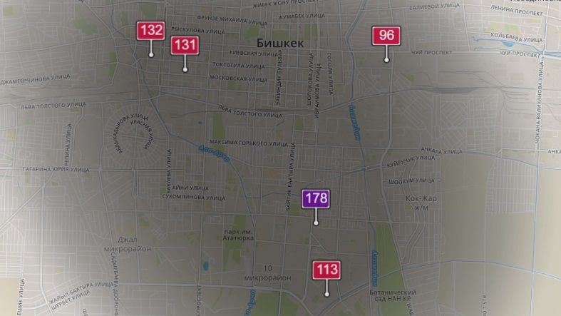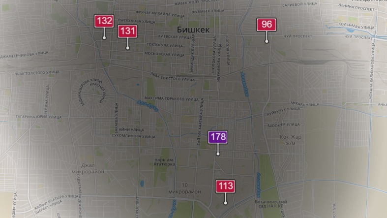 - в районе улиц Бейшеналиевой/Токтогула. Уровень загрязнения превышен в 3,49 раза: PM2.5 среднесуточный — 122 мкг/м³, на момент измерения — 132 мкг/м³;