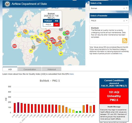 Посольство США в Кыргызстане также установило датчик. Он показывает индекс качества воздуха в режиме онлайн. Информация обновляется ежечасно.