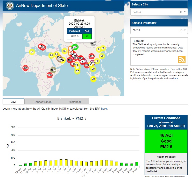 Посольство США в Кыргызстане также установило датчик. Он показывает индекс качества воздуха в режиме онлайн. Информация обновляется ежечасно.