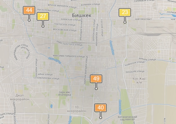 - в районе улиц Бейшеналиевой/Токтогула. Уровень загрязнения превышен в 1,14 раза: PM2.5 среднесуточный — 40 мкг/м³, на момент измерения — 45 мкг/м³;
