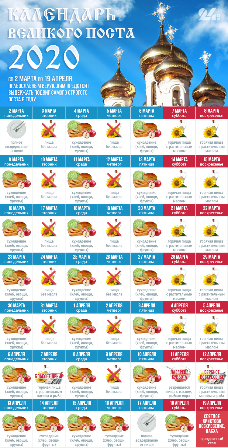 Самыми строгими считаются первая и последняя недели поста. В первый день поста, 2 марта, разрешено пить только воду. Во второй день можно съесть немного постного хлеба и пить воду. В остальные пять дней первой недели Великого поста предписано сухоядение.
