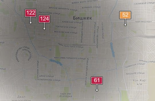 - в районе улиц Бейшеналиевой/Токтогула. Уровень загрязнения превышен в 1,49 раза: PM2.5 среднесуточный — 52 мкг/м³, на момент измерения — 122 мкг/м³;