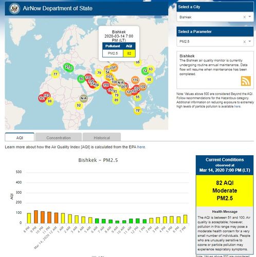 Посольство США в Кыргызстане также установило датчик. Он показывает индекс качества воздуха в режиме онлайн. Информация обновляется ежечасно.