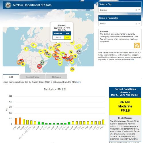 Посольство США в Кыргызстане также установило датчик. Он показывает индекс качества воздуха в режиме онлайн. Информация обновляется ежечасно.