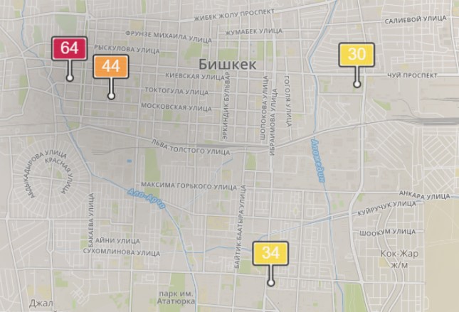 - в районе улиц Бейшеналиевой/Токтогула. Уровень загрязнения превышен в 1,14 раза: PM2.5 среднесуточный — 40 мкг/м³, на момент измерения — 64 мкг/м³;