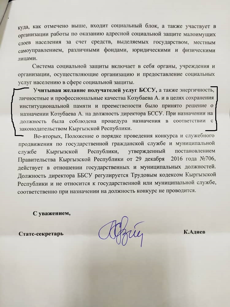 Он добавил: в министерстве назначение объяснили тем, что глава ведомства Улукбек Кочкоров подписал приказ о назначении, «учитывая пожелания получателей услуг БССУ».