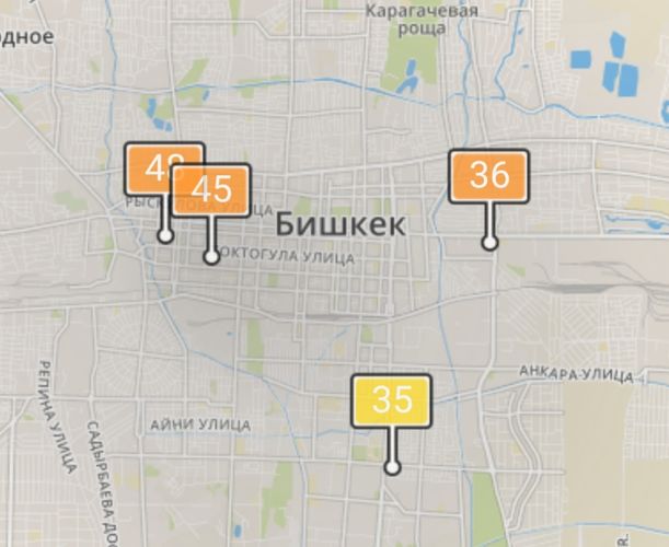- в районе улиц Бейшеналиевой/Токтогула. Уровень загрязнения превышен в 1,4 раза: PM2.5 среднесуточный — 48 мкг/м³, на момент измерения — 48 мкг/м³;