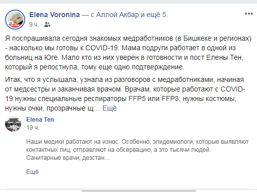 «Вот о чем они перешептываются: «С такими темпами работы мы вскоре будем иметь огромное число зараженных из числа врачей... Я на карантине уже трое суток, как рабочая сила... У нас вообще не хватает СИЗ и респираторов ffp2 и ffp3... МЗ КР не обеспечивает нас... Помогите донести до ответственных лиц», — написала Елена Баялинова.