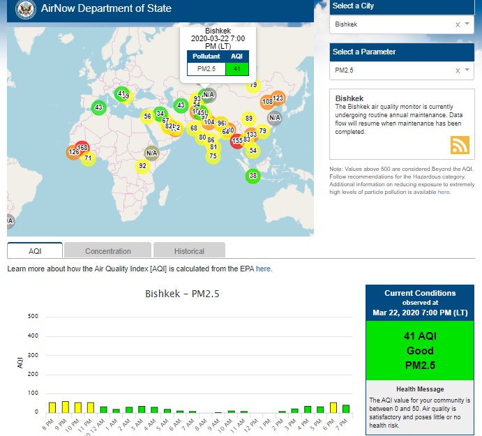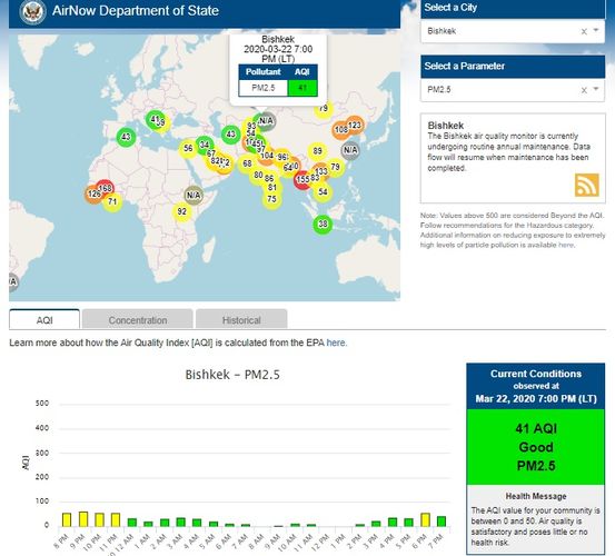 Посольство США в Кыргызстане также установило датчик. Он показывает индекс качества воздуха в режиме онлайн. Информация обновляется ежечасно.