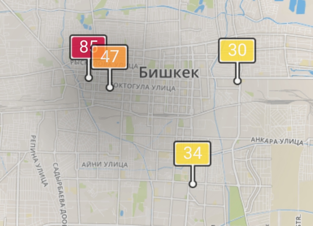 - в районе улиц Бейшеналиевой/Токтогула. Уровень загрязнения превышен: PM2.5 среднесуточный — 32 мкг/м³, на момент измерения — 85 мкг/м³;
