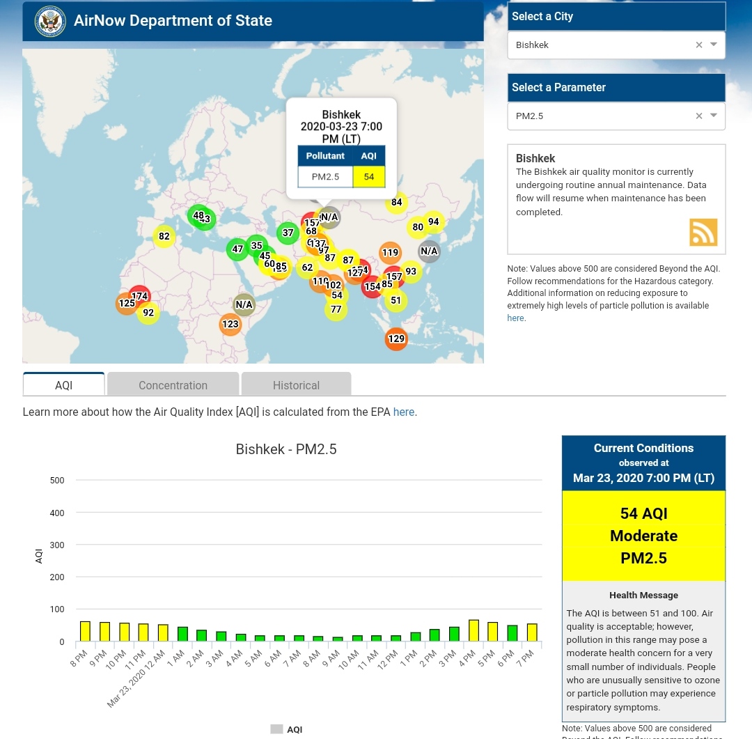 Посольство США в Кыргызстане также установило датчик. Он показывает индекс качества воздуха в режиме онлайн. Информация обновляется ежечасно.