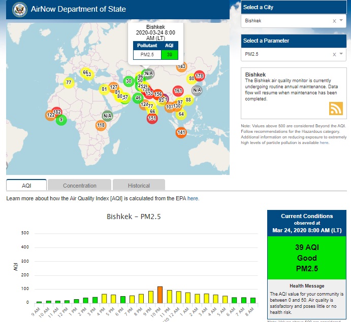 Посольство США в Кыргызстане также установило датчик. Он показывает индекс качества воздуха в режиме онлайн. Информация обновляется ежечасно.