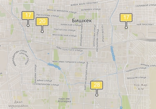 - в районе улиц Бейшеналиевой/Токтогула. Уровень загрязнения превышен незначительно: PM2.5 среднесуточный — 36 мкг/м³, на момент измерения — 17 мкг/м³;