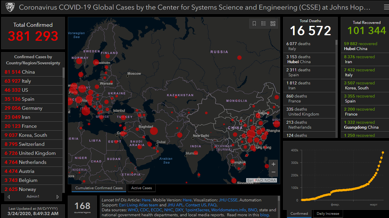 Отмечается, что за сутки показатель вырос на 3 тысячи 11 человек. В мире зафиксировали 381 тысячу 293 факта заражения коронавирусом. За последние сутки рост составил 45 тысяч 293 случая.