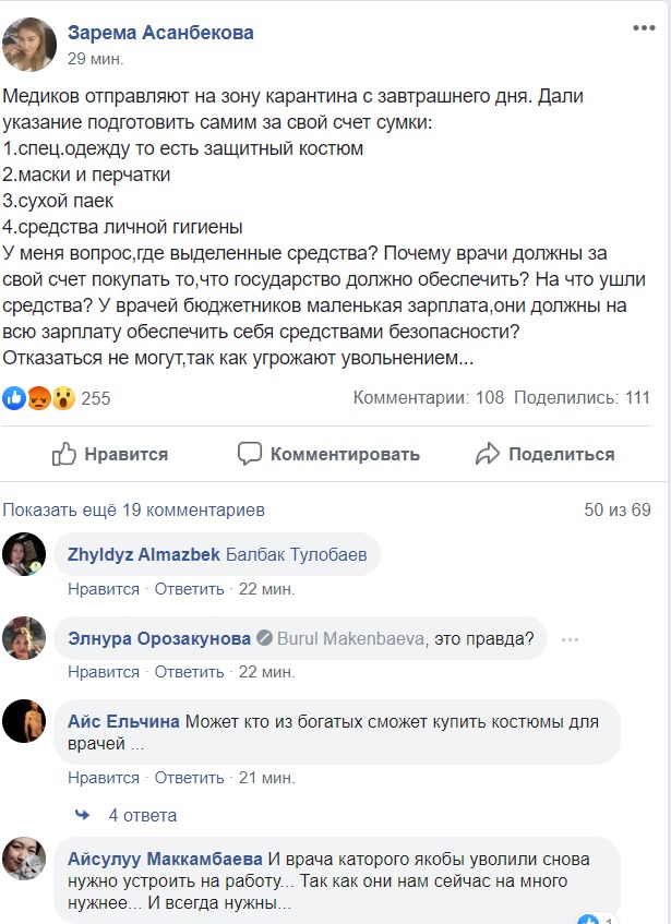 Врачей, которые работают в карантинных пунктах, заставляют покупать необходимые медицинские принадлежности за свой счет. Об этом в Facebook написала пользователь Зарема Асанбекова.