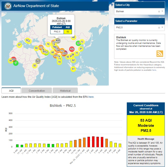 Посольство США в Кыргызстане также установило датчик. Он показывает индекс качества воздуха в режиме онлайн. Информация обновляется ежечасно.