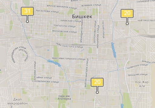 - в районе улиц Бейшеналиевой/Токтогула. Уровень загрязнения превышен в 1,4 раза: PM2.5 среднесуточный — 49 мкг/м³, на момент измерения — 31 мкг/м³;