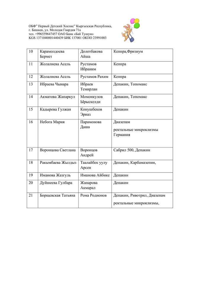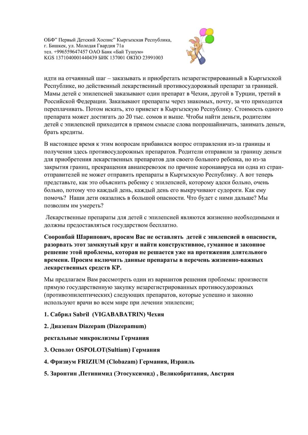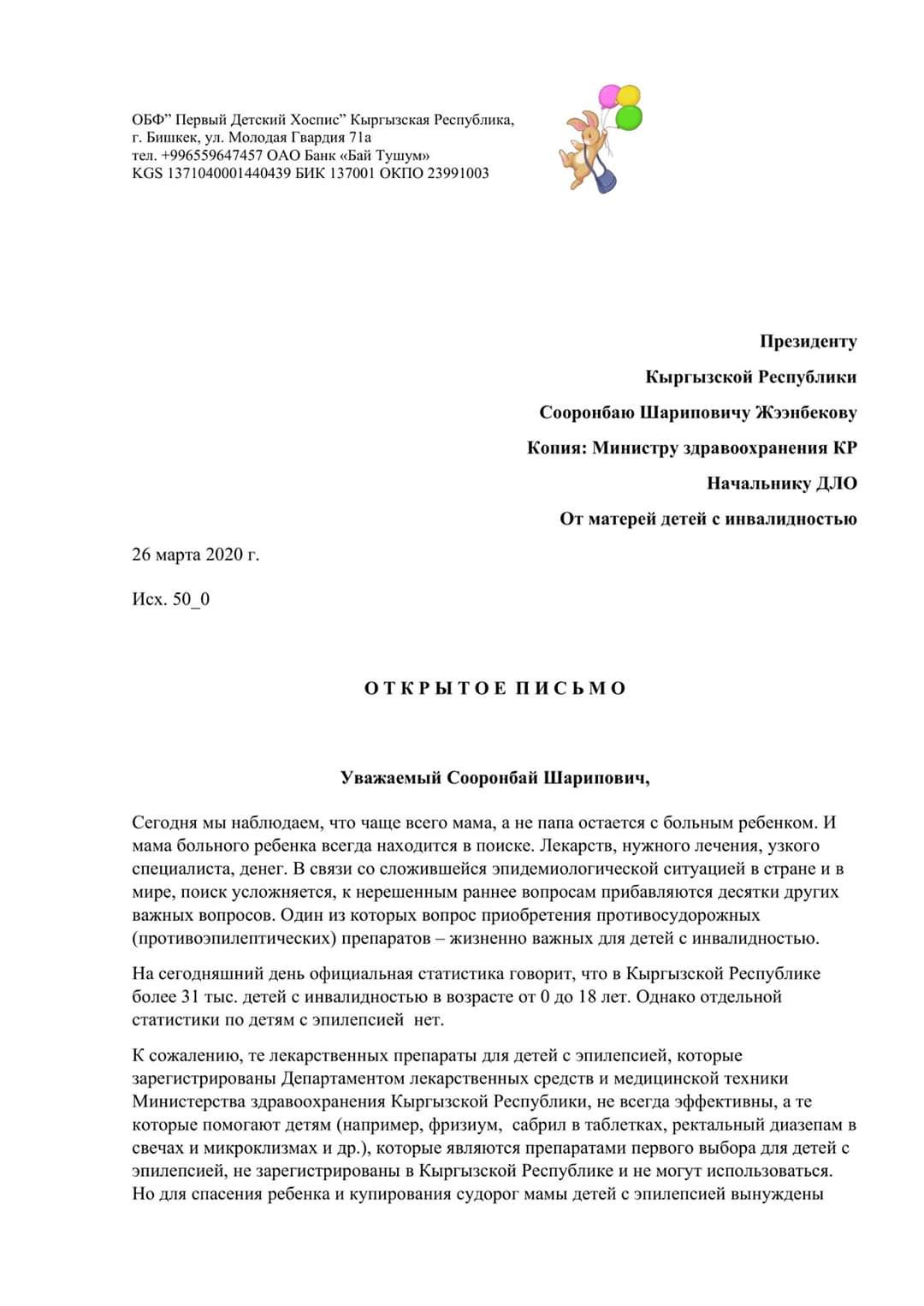 Они просят Сооронбая Жээнбекова помочь во включении препаратов в перечень жизненно важных лекарственных средств КР. И как вариант решения сложившейся проблемы произвести прямую государственную закупку незарегистрированных противосудорожных (противоэпилептических) препаратов, которые успешно и законно используют врачи во всем мире.