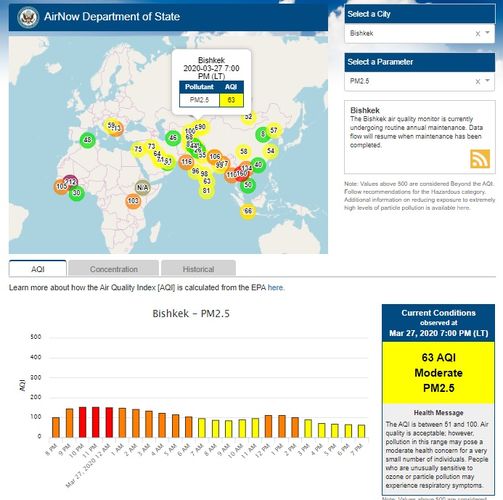 Посольство США в Кыргызстане также установило датчик. Он показывает индекс качества воздуха в режиме онлайн. Информация обновляется ежечасно.