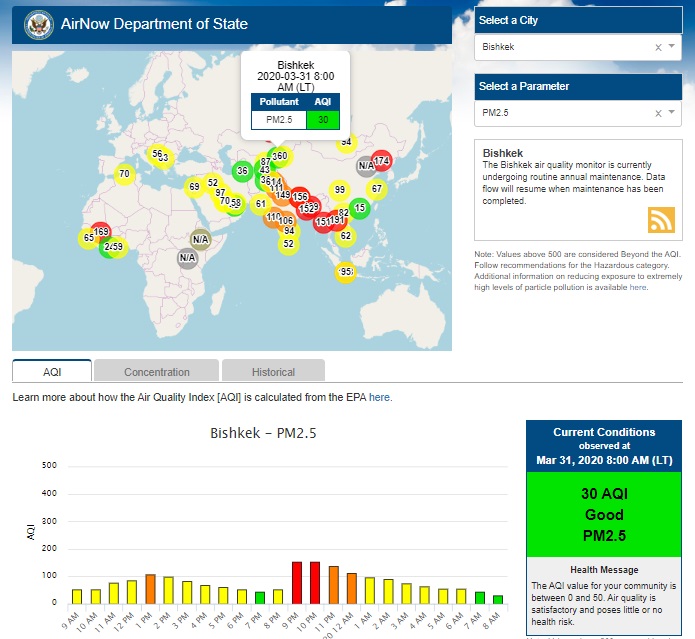 Посольство США в Кыргызстане также установило датчик. Он показывает индекс качества воздуха в режиме онлайн. Информация обновляется ежечасно.