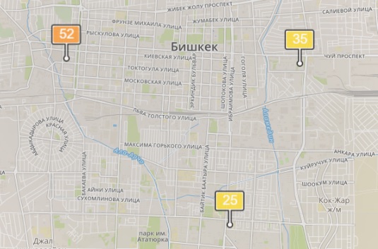 - в районе улиц Бейшеналиевой/Токтогула. Уровень загрязнения превышен в 1,63 раза: PM2.5 среднесуточный — 57 мкг/м³, на момент измерения — 52 мкг/м³;