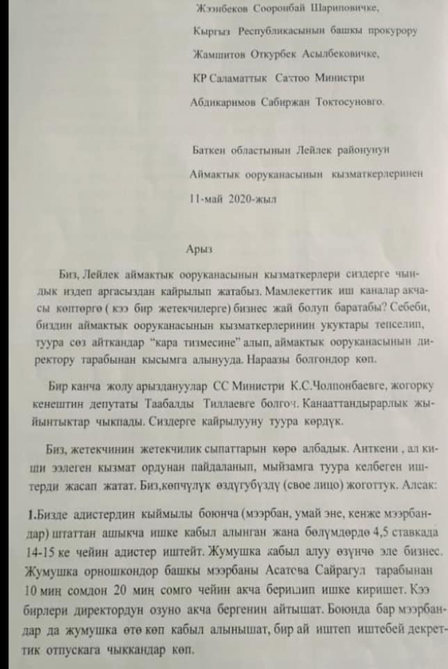 «Асан Кожомов работу в больнице превратил в бизнес. Он открывает лишние вакансии и берет на работу внештатников. Все, кто устраивается на работу, отдали главной медсестре больницы Сайрагуль Асатовой от 10 до 20 тысяч сомов. Некоторые говорят, что деньги давали лично директору», — пишут медики районной больницы.