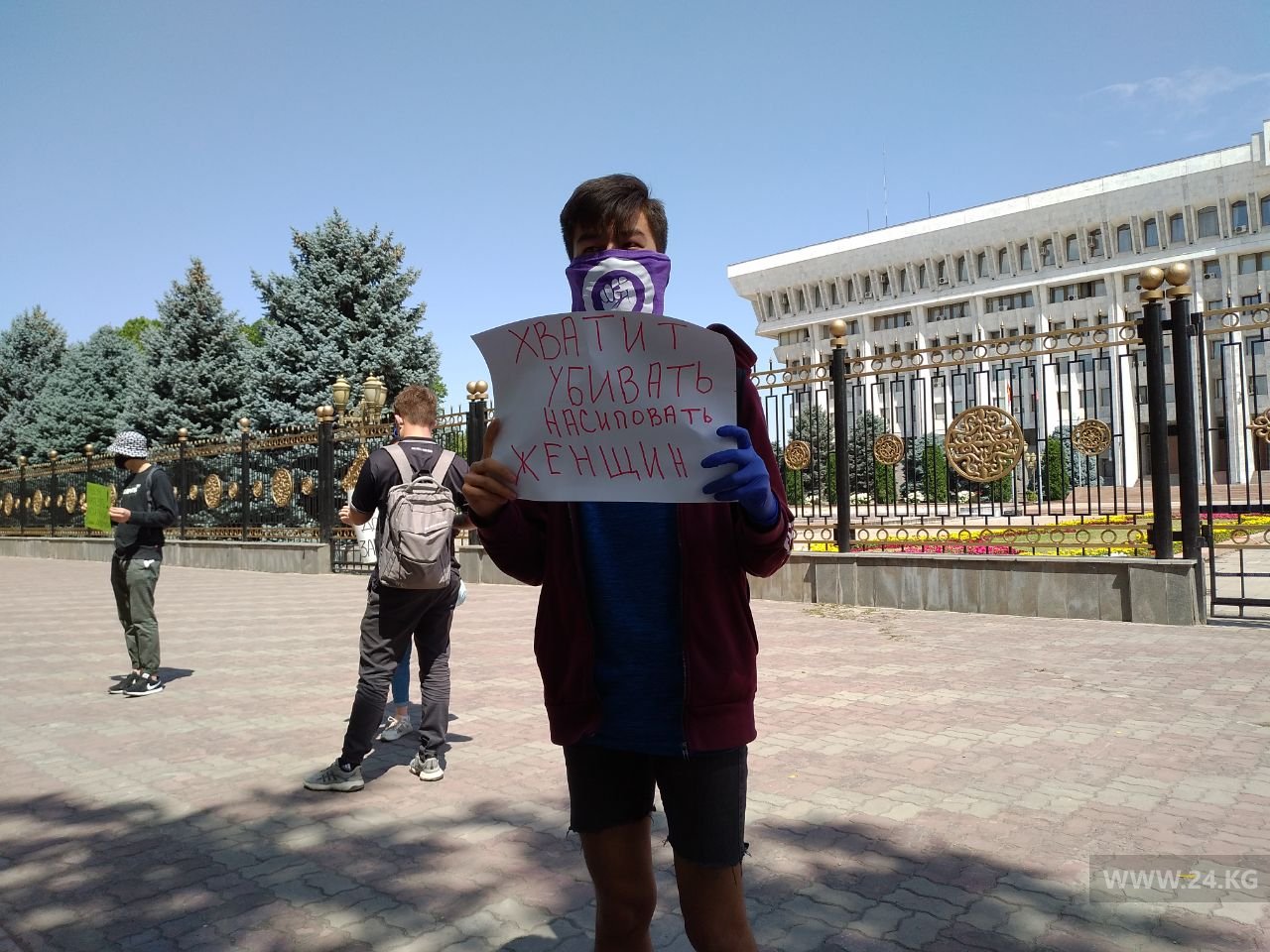 В Бишкеке проходит акция против семейного насилия. Четверо участников, соблюдая дистанцию, встали напротив «Белого дома». Они держат плакаты с призывами: «Милиция должна защищать», «Наказывать надо реальных преступников», «Хватит убивать и насиловать женщин!».
