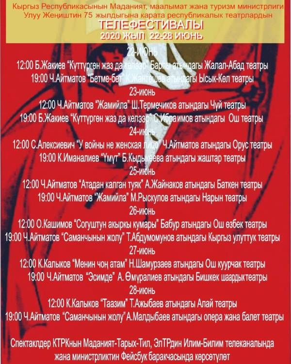 Каналы «Маданият. Тарых. Тил» , «Илим жана билим» и официальная страница Министерства, культуры, информации и туризма в Facebook, 12.00 и 19.00.