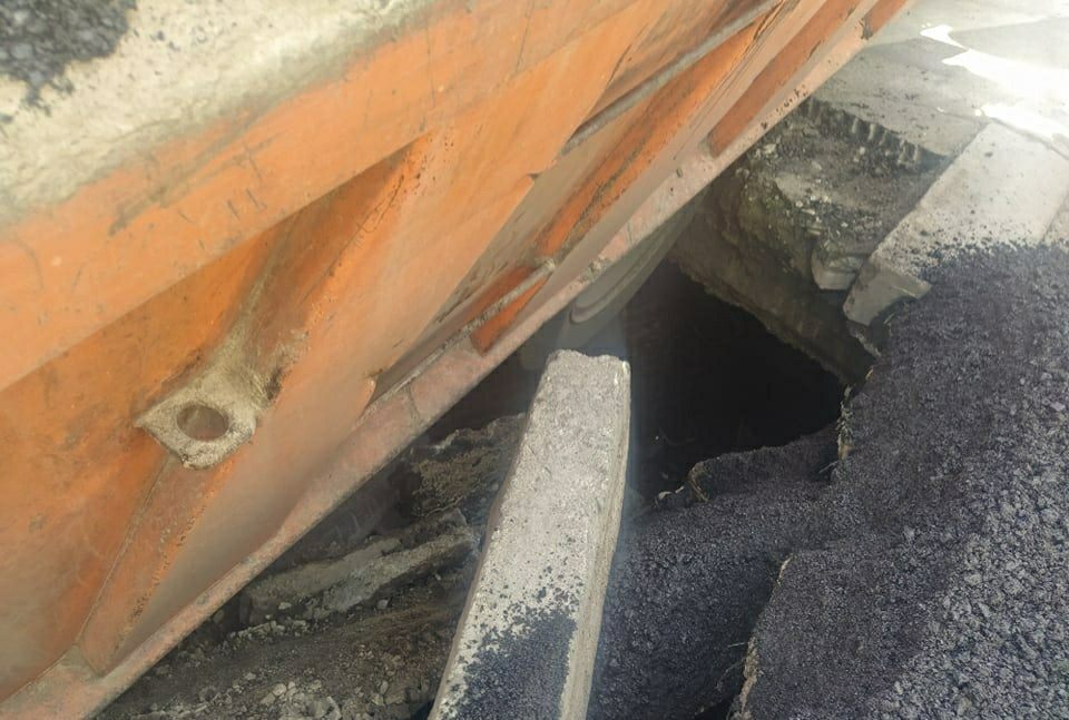 На кадрах видно, что он вез за собой прицепом бочку, скорее всего, с битумом. После происшествия черная жидкость вылилась на дорогу. В кузове грузовой машины находился асфальт.