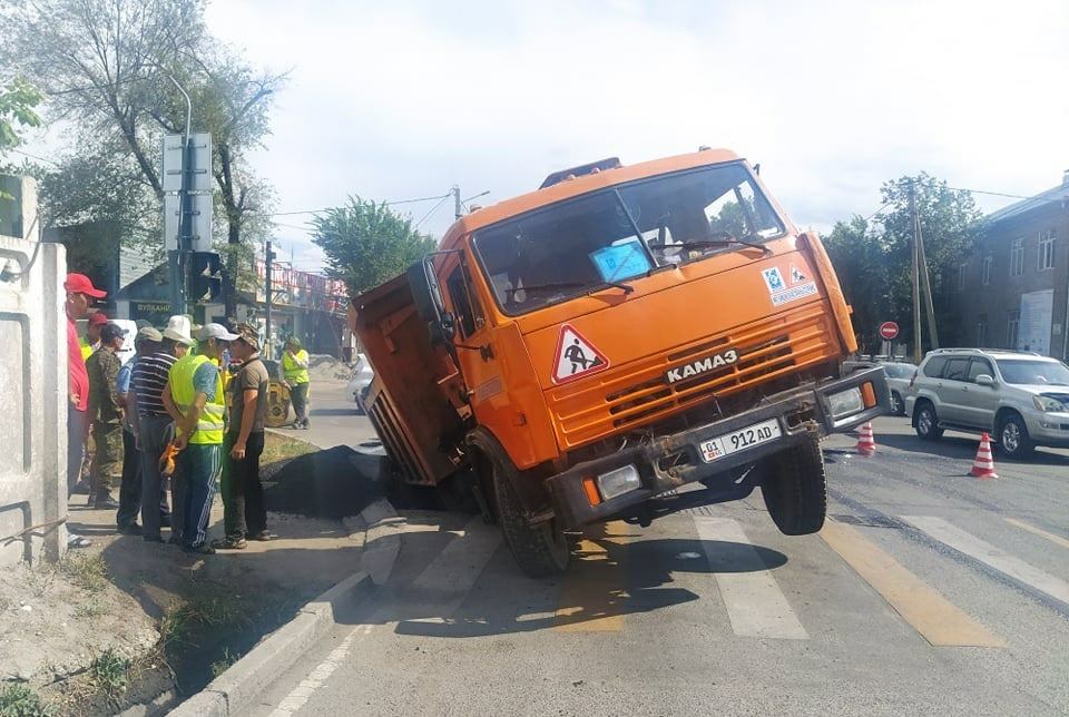 На улице Толстого КамАЗ Бишкекасфальтсервиса провалился колесом в арык. Фотографии выложили в группе «Черный список — нам не понравилось».