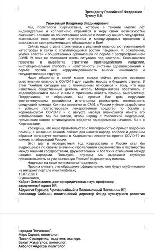 «Уважаемый Владимир Владимирович! Мы, политологи Кыргызстана, которые в течение многих лет индивидуально и коллективно стремимся в меру своих возможностей оказывать влияние на общественное мнение и политику нашего государства, высказывая свое видение внутренних и международных процессов, и высказывая свои рекомендации, обращаемся к вам. Сейчас наша страна столкнулась с реальной опасностью гуманитарной катастрофы в связи с усугубляющимся ростом пандемии», — говорится в тексте.