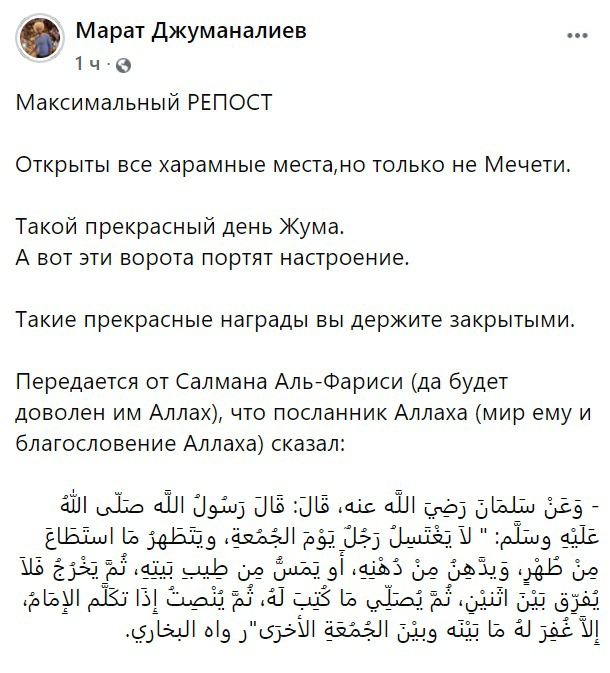 Он считает, что открылись все харамные места, но только не мечети. «Такой прекрасный день жума. А вот эти ворота портят настроение. Такие прекрасные награды вы держите закрытыми», — написал Марат Джуманалиев.