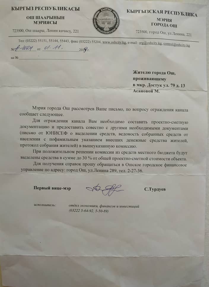 Мээрим Асанова рассказала, что письмо от ЮНИСЕФ и проектно-сметную документацию на 560 тысяч сомов они предоставили городскому управлению. «После ЮНИСЕФ попросил у мэрии документ о соглашении с Управлением капитального строительства о выполнении работ по ограждению. Мы, жители, между ними ходили и просили муниципалитет предоставить соглашение с УКС, но мэрия заявила, что им нужно показать оставшиеся 70 процентов суммы для ограждения канала. ЮНИСЕФ также просил показать сумму от мэрии. В итоге МТУ и городская мэрия оставили процесс без движения», — пожаловалась Мээрим Асанова.