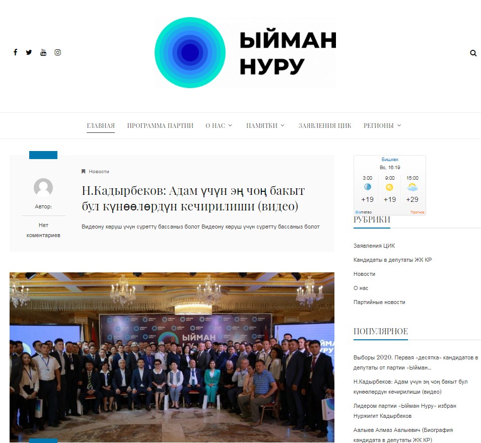 На сайте партии «Ыйман Нуру» nuriman.kg размещены программа, заявления ЦИК и информация о самой политорганизации. Последние новости датируются 21 августа. Есть краткое содержание программы партии и список первой десятки кандидатов в депутаты Жогорку Кенеша.