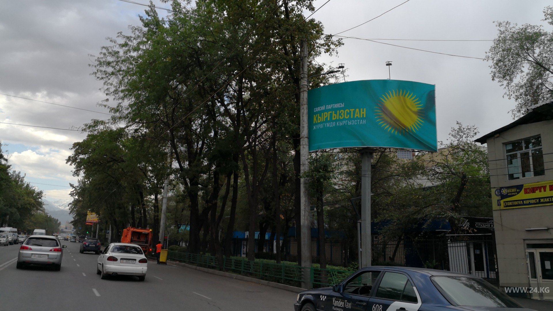 На отрезке от проспекта Чуй до Ахунбаева больше всего агитационных материалов партии «Биримдик». Самый масштабный баннер — на мосту по улице Льва Толстого.