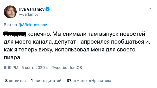 Российский блогер Илья Варламов, который сейчас находится в Бишкеке, возмущен, что кандидат в депутаты Марлен Маматалиев использовал его для своего личного пиара. Об этом он написал на своей странице в микроблоге Twitter.