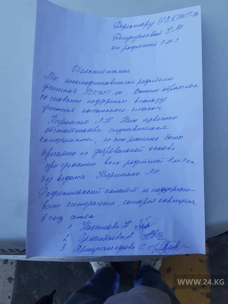 «Мы, родители учеников начального класса школы № 70, хотим обратиться со словами поддержки учителя. Решение о сборе денег мы приняли добровольно при участии всех родителей первого класса без ведома директора», — рассказали родители.