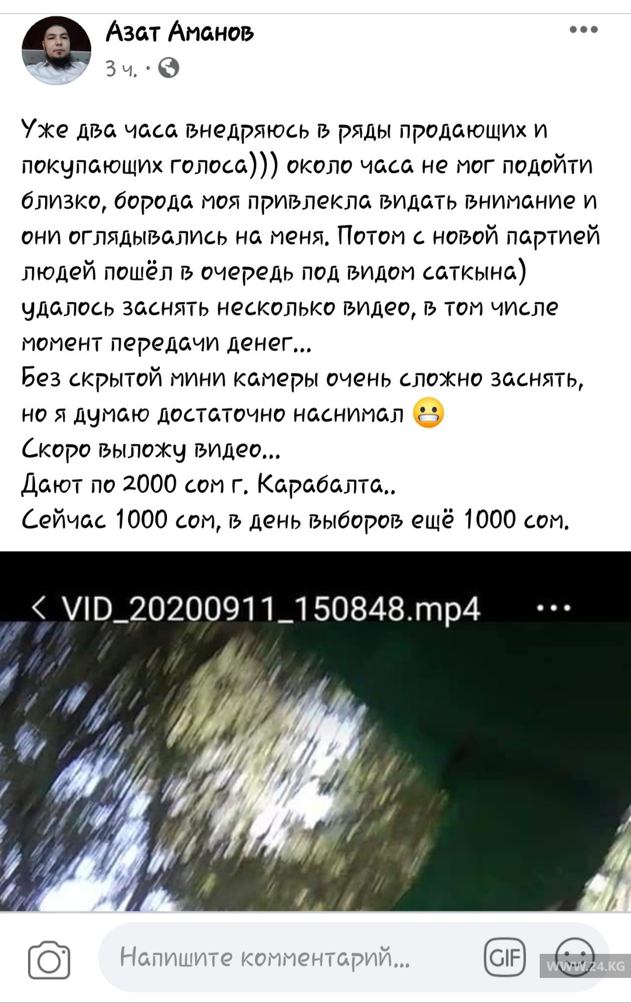 По ее данным, 11 сентября пользователь Азат Аманов опубликовал пост, где говорилось, что он стал свидетелем того, как возле школы № 3 в Кара-Балте неизвестные лица от имени политической партии выдают избирателям по 1 тысяче сомов. В день голосования этим же избирателям якобы доплатят еще по 1 тысяче сомов.