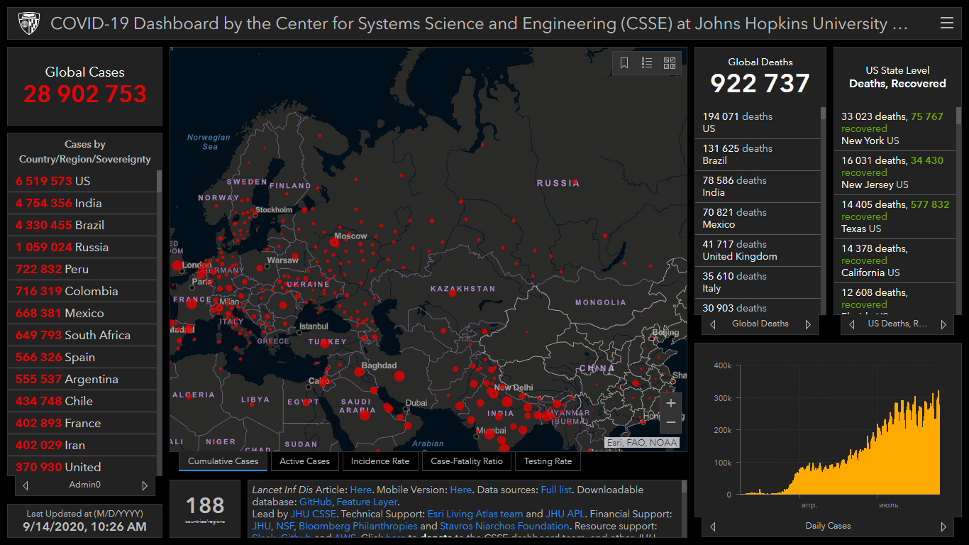 Всего в мире коронавирусом заразились 28 миллионов 902 тысячи 753 человека. Больше всего зараженных в США (6 миллионов 519 тысяч 573), Индии (4 миллиона 754 тысячи 356), Бразилии (4 миллиона 330 тысяч 455), России (1 миллион 59 тысяч 24), Перу (722 тысячи 832), Колумбии (716 тысяч 319), Мексике (668 тысяч 381), Южной Африке (649 тысяч 793) и Испании (566 тысяч 326).