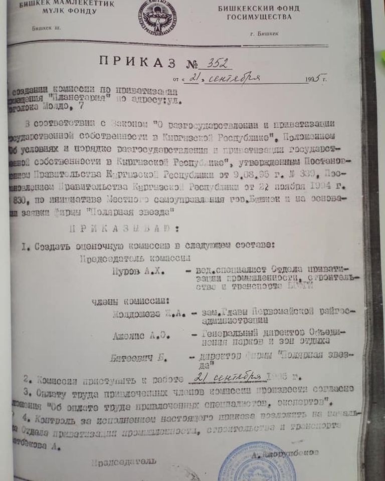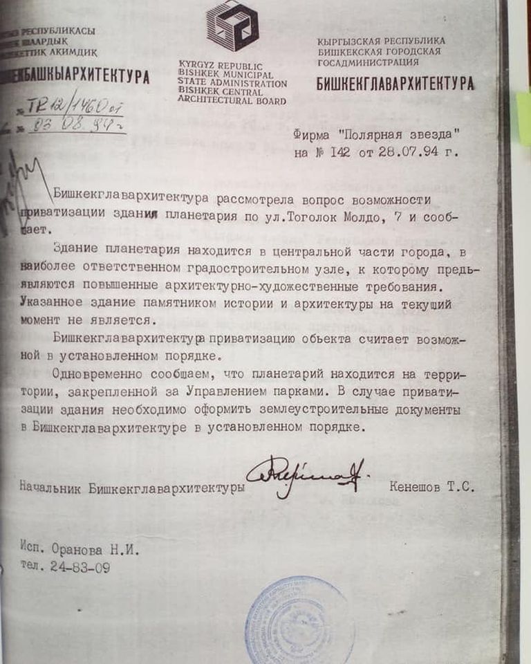 «Но де-факто оказалось все по-другому. Там был ночной клуб, кафе, здание неоднократно перепродавалось. Несколько лет назад его владельцем стал сын экс-спикера Чыныбая Турсунбекова. Насколько нам известно, на этом месте они хотели построить гостиницу под мировым брендом. Но по многим параметрам строительство там отеля будет не самым хорошим решением с точки зрения городского планирования. Здание планетария находится рядом с охранной зоной, где любое крупное строительство запрещено», — отметил он.