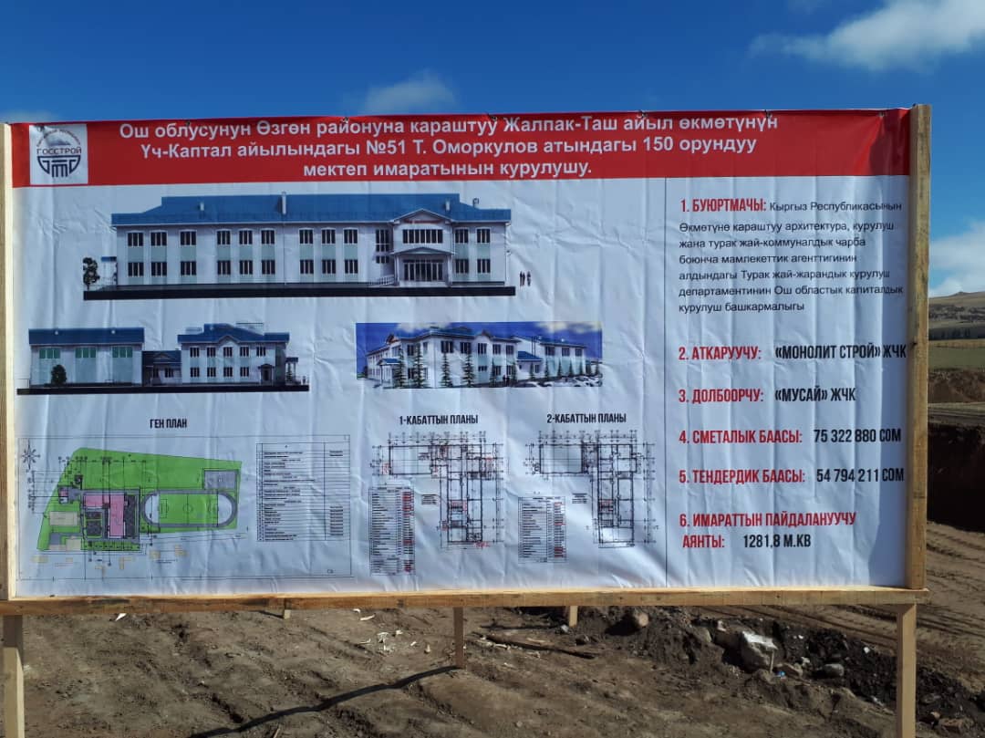 Кроме того, началось строительство нового здания школы имени Оморкулова на 150 мест в селе Уч-Каптал. В ведомстве отметили, что в населенном пункте в 1990 году была построена школа, но она пострадала от землетрясения 17 ноября 2015 года. На строительные работы из республиканского бюджета выделено 54 миллиона сомов.