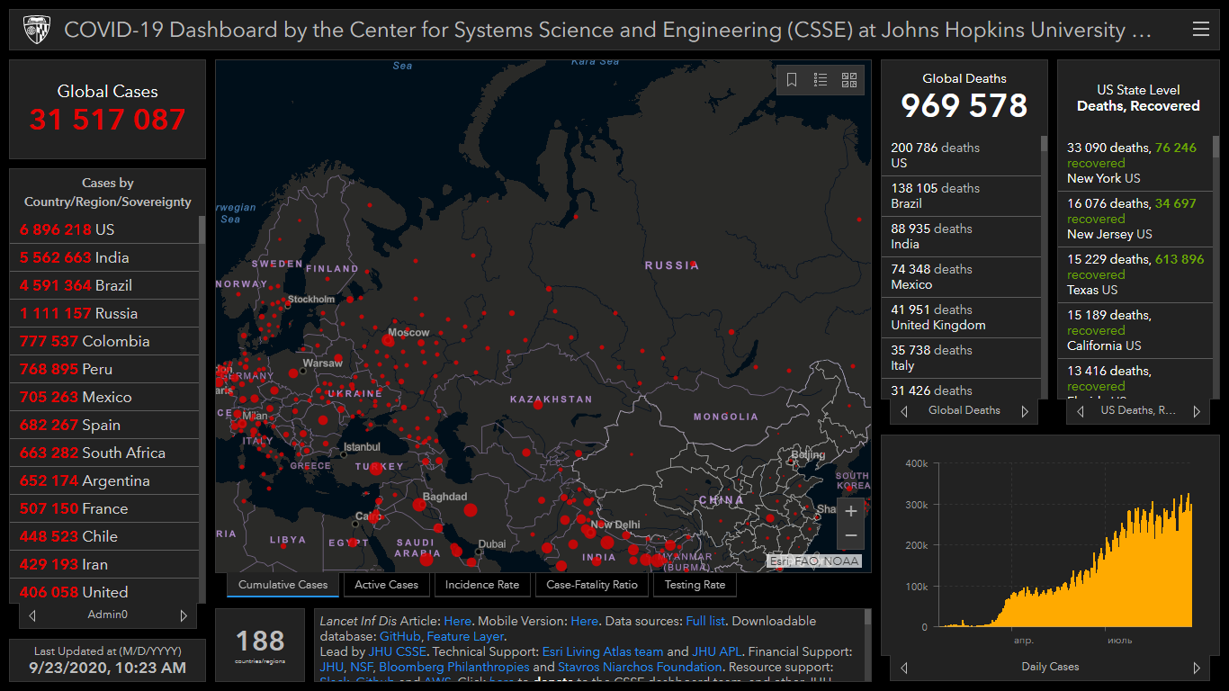 Всего в мире коронавирусом заразились 31 миллион 517 тысяч 87 человек. Больше всего зараженных в США (6 миллионов 896 тысяч 218), Индии (5 миллионов 562 тысячи 663), Бразилии (4 миллиона 591 тысяча 364), России (1 миллион 111 тысяч 157), Колумбии (777 тысяч 537), Перу (768 тысяч 895), Мексике (705 тысяч 263), Испании (682 тысячи 267) и Южной Африке (663 тысячи 282).